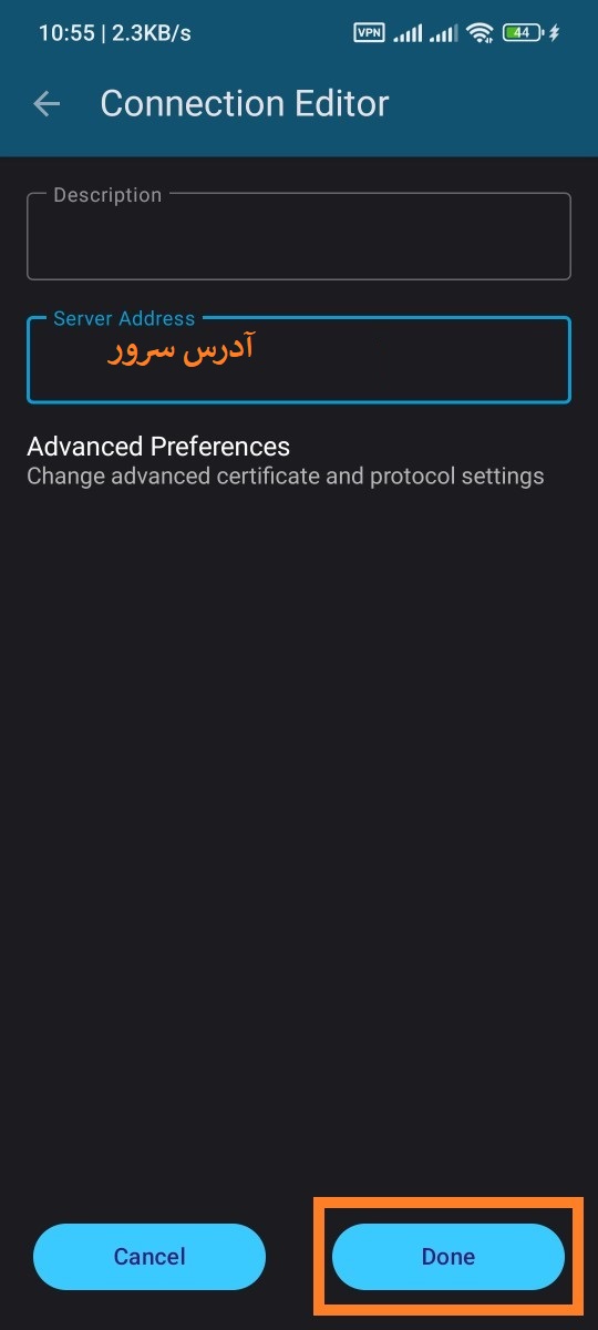 در اینجا شما باید آدرس سرور دریافتی خود رو در کادر Server Address وارد کنید و در صورت تمایل یک نام هم در کادر Description برای آن وارد کنید