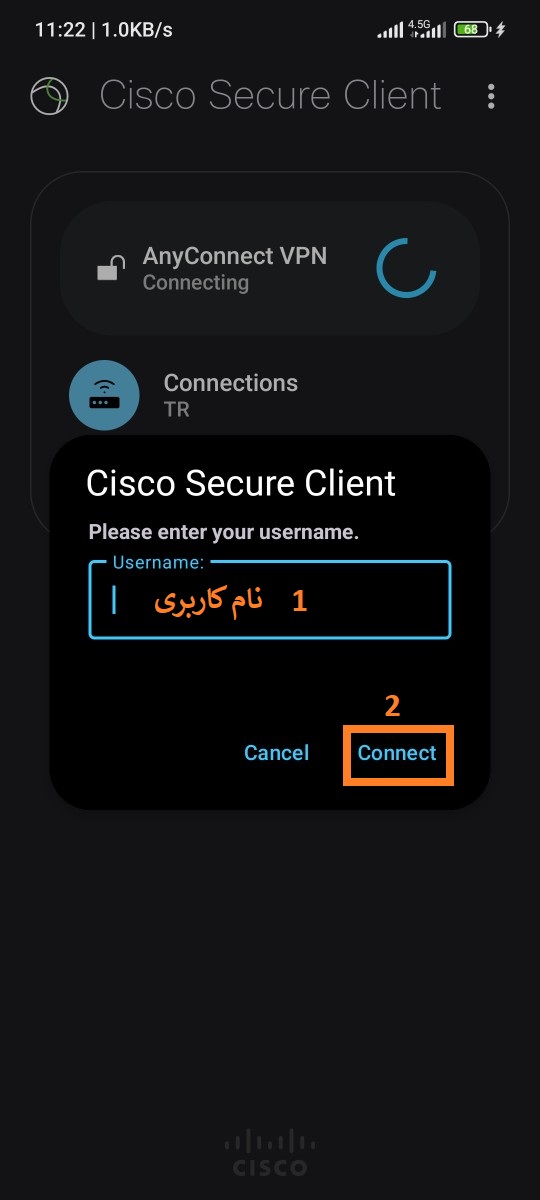 سپس در این قسمت یوزرنیم یا همان نام کاربری خریداری شده خود را وارد کنید و گزینه Connect را بزنید