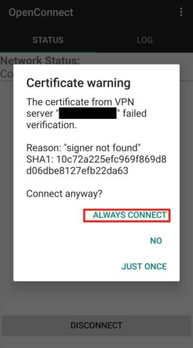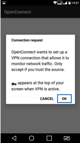 توجه داشته باشید که اپلیکیشن Openconnect اجازه دسترسی به قسمت ” VPN ” دستگاه را جهت اضافه کردن کانکشن درخواست میکند. و نیاز هست آن را تایید کنید!