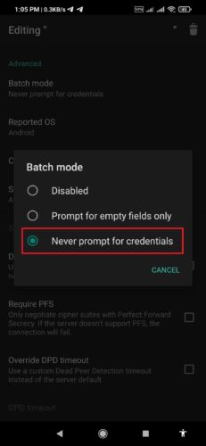 و سپس اولین گزینه بخش Advanced یعنی Batch mode را بروی حالت Never prompt for credentials قرار دهید 👌