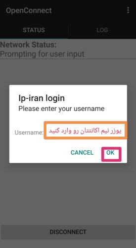 سپس یوزرنیم و نام کاربری خریداری شده خود را وارد کنید و گزینه Ok را بزنید