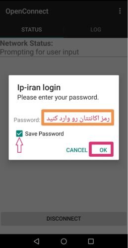 و حال کلمه عبور خود را وارد و نمایید و ترجیحا تیک گزینه Save Password را نیز بزنید تا پسورد شما ذخیره شود و در اتصالات بعدی، نیاز به تایپ کردن و نوشتن مجدد پسورد نباشد