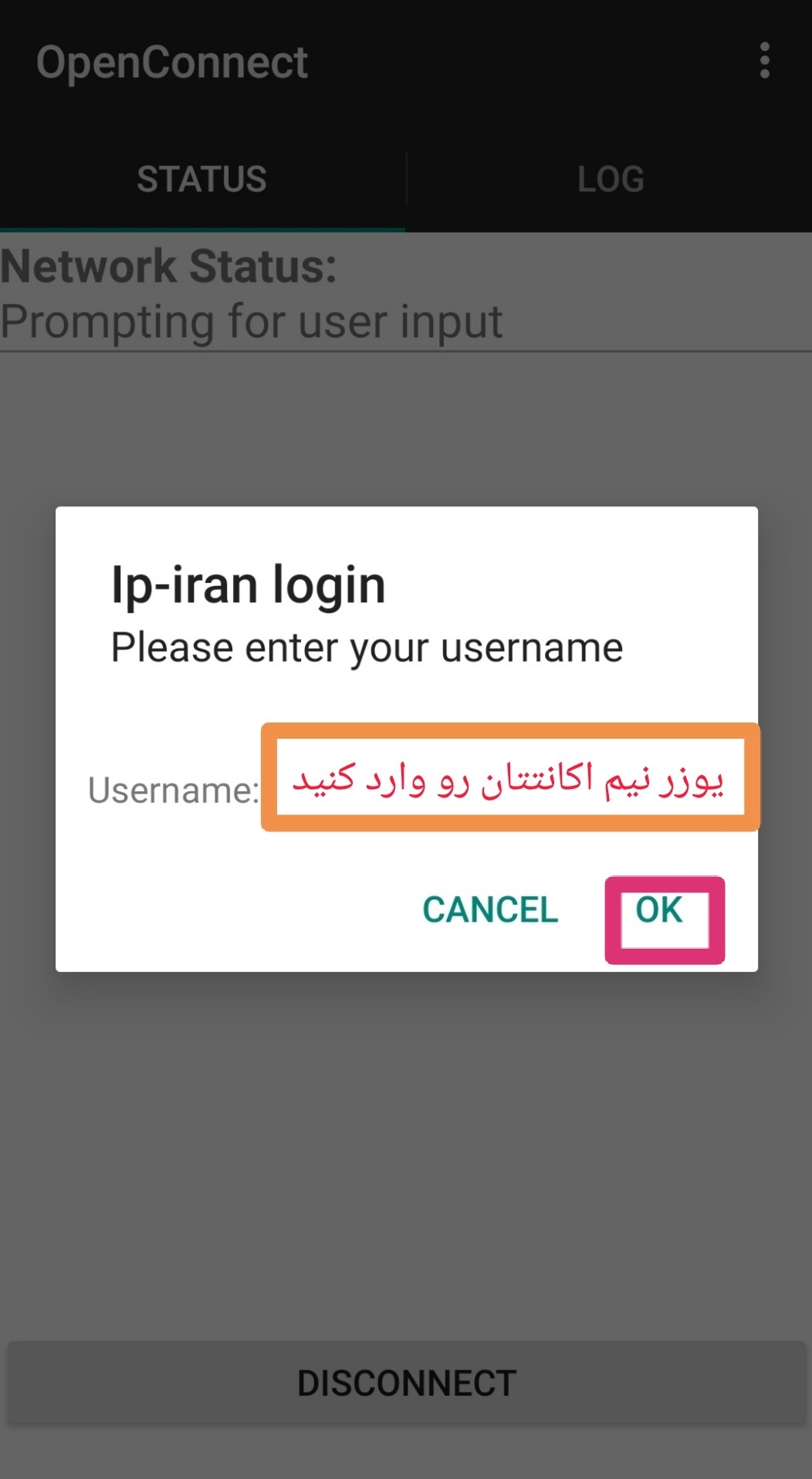 سپس یوزرنیم و نام کاربری خریداری شده خود را وارد کنید و گزینه Ok را بزنید